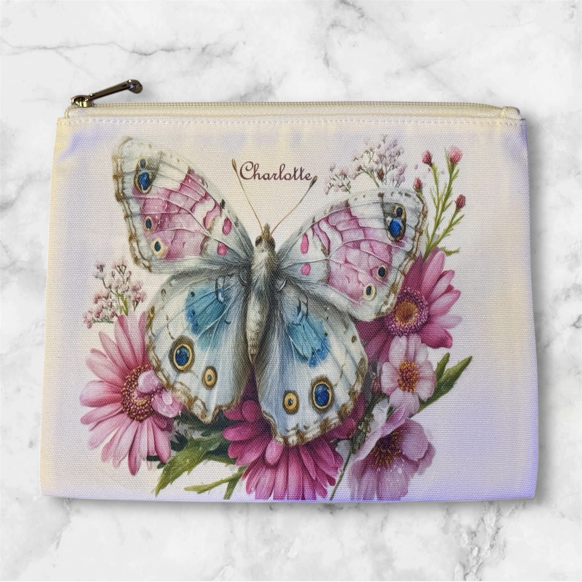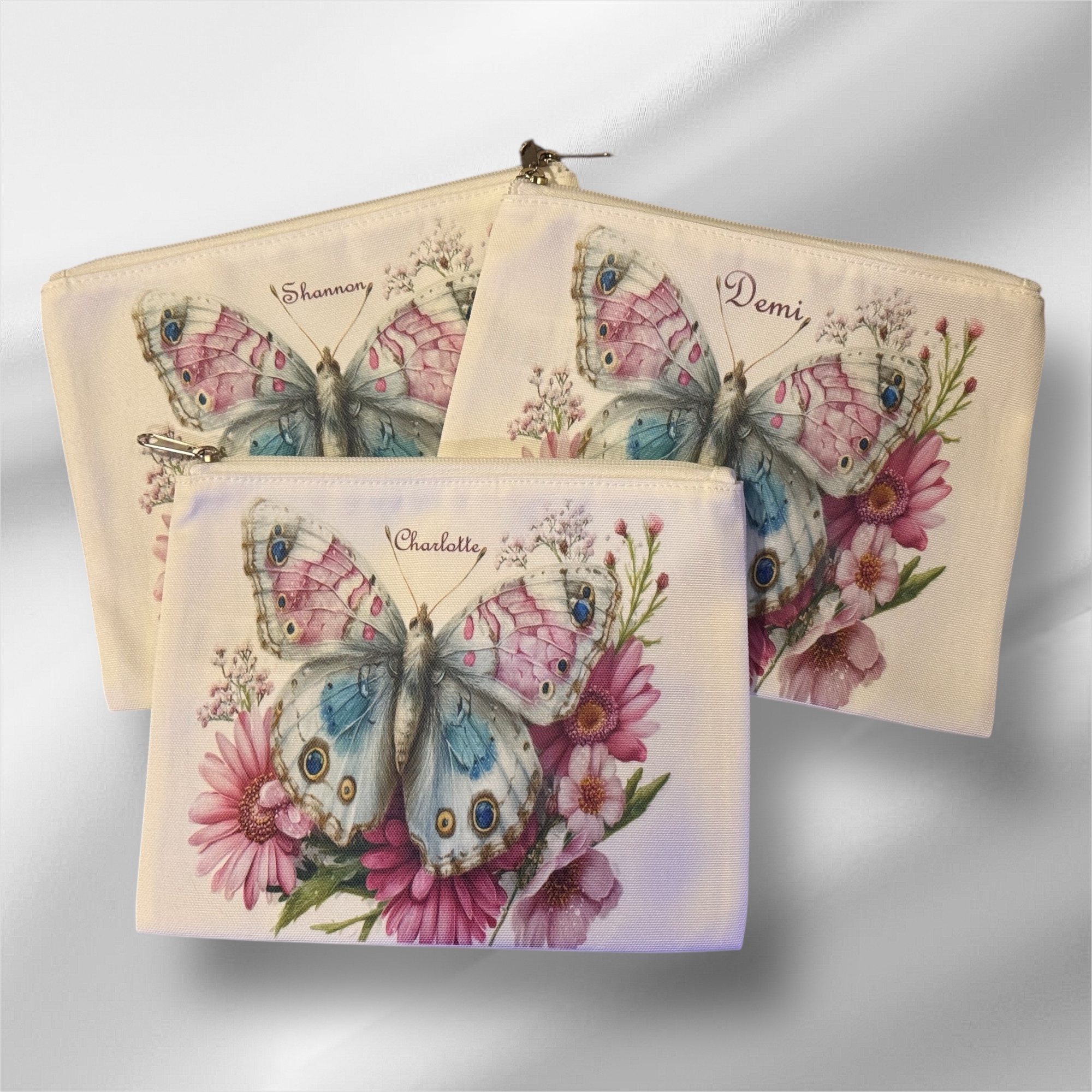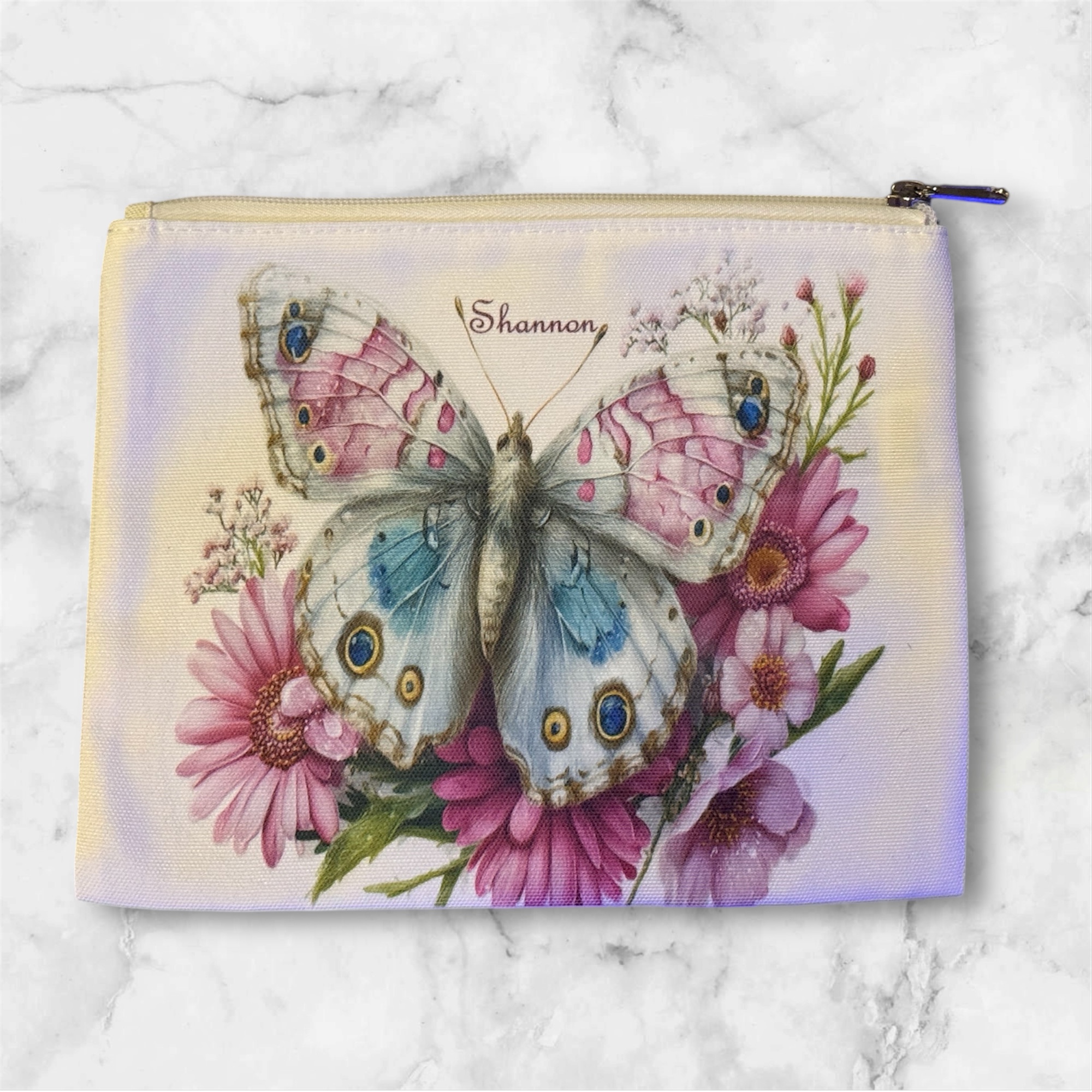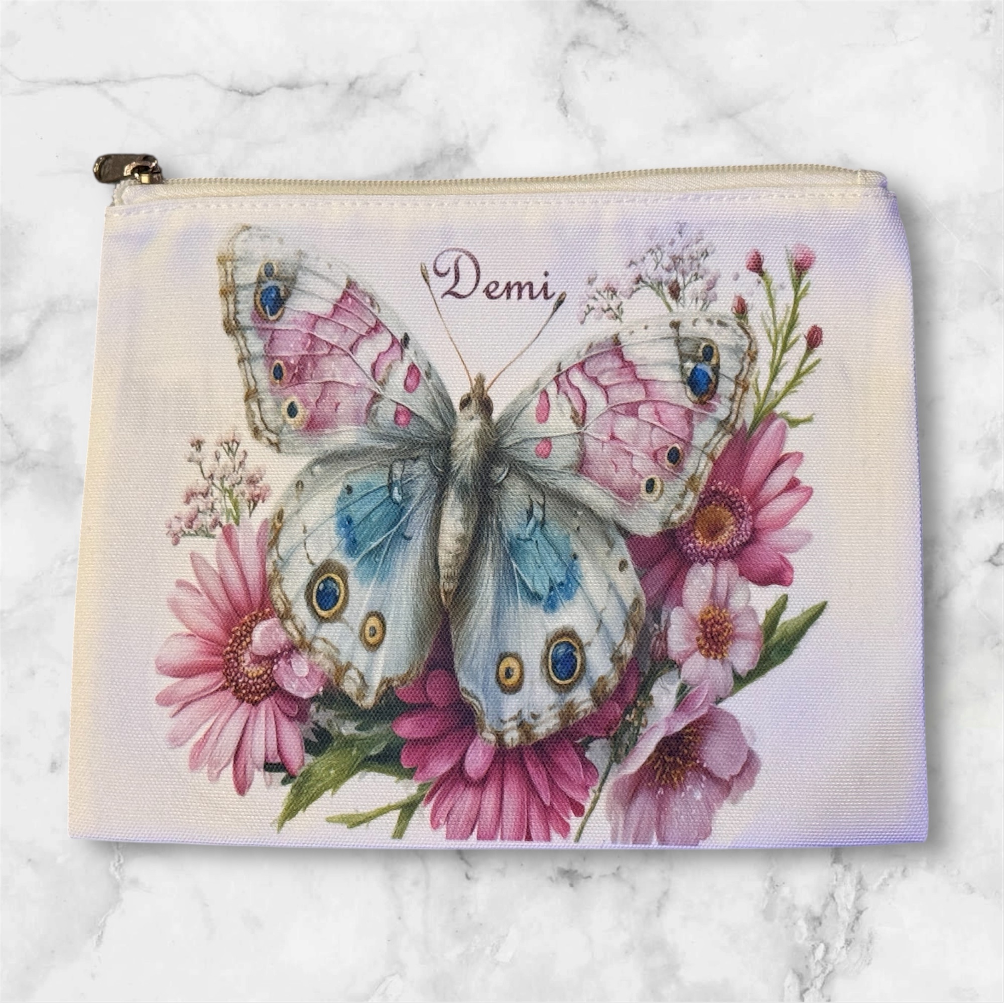 Elevate your daily beauty ritual with this Personalised Canvas Butterfly Cosmetic Bag. Combining the natural, rustic appeal of a canvas texture with a vibrant, whimsical butterfly motif, this zip-up pouch is designed to be as unique as the person carrying it.